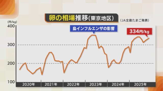 ケーキの材料として欠かすことのできない卵。JA全農たまごによると、卵の相場は2023年に鳥インフルエンザの影響で過去最高に。2024年以降も鳥インフルエンザの余波に加え、飼料価格の高騰、猛暑などが影響し値上がりが続いた。