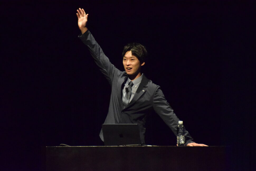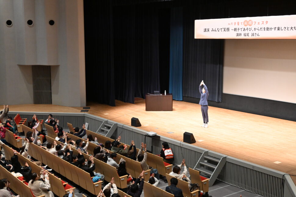 今回のイベントの一番の目玉はこちら、NHK Eテレ「おかあさんといっしょ」第12代体操のお兄さん、福尾誠さんによる講演です。会場には子育て世代の親子など、市内外から約700人が集まりました。