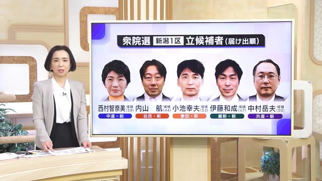 【新潟1区・第一声】中道・前職 西村智奈美氏/自民・新人 内山航氏/参政・新人 小池幸夫氏/維新・新人 伊藤和成氏/共産・新人 中村岳夫氏