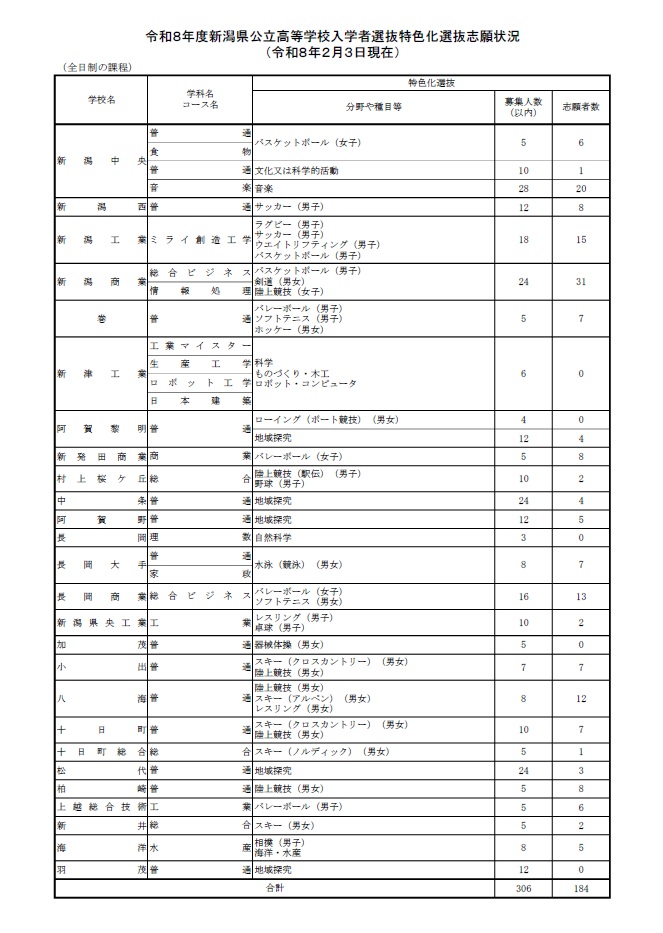 【高校入試・新潟県】公立高校「特色化選抜」志願状況発表 募集306人に対して184人が出願 「特色化選抜」は今年度で廃止