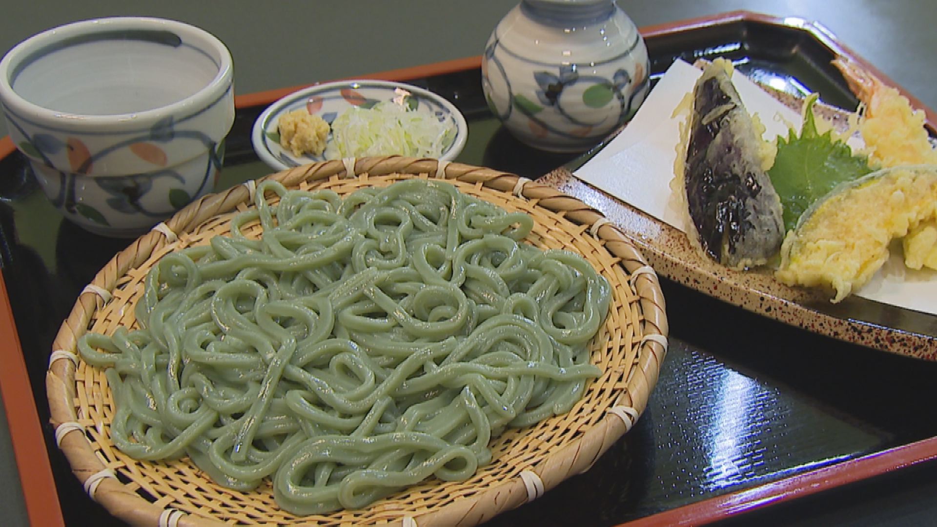 県産のクマザサを生地に練り込み、のど越しを良くするため、通常のうどんよりやや細く切った「笹切りうどん」です。