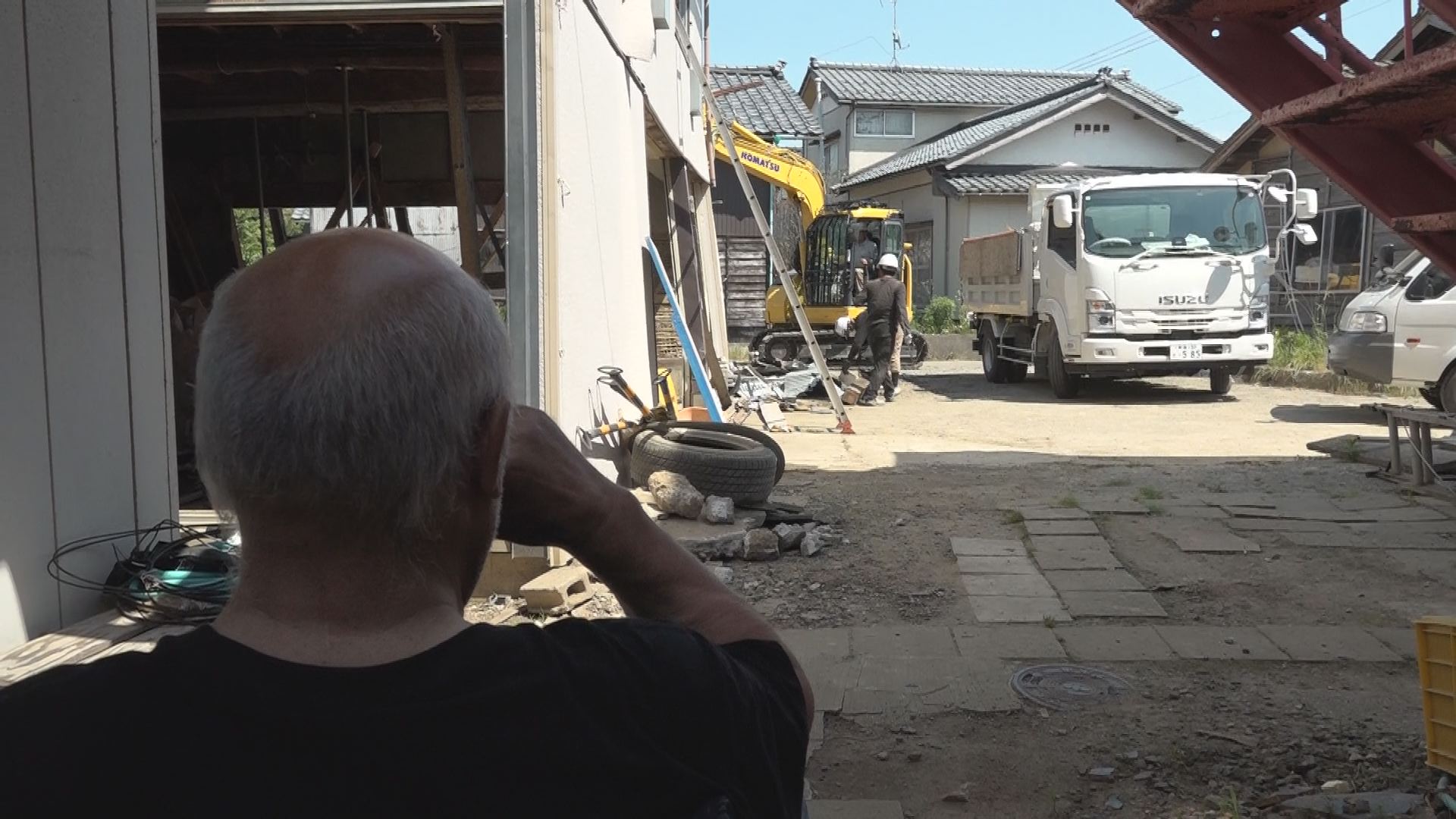 近くに置いたいすに腰を下ろし、じっと作業を見つめる郁夫さん。その目には涙が浮かんでいた。