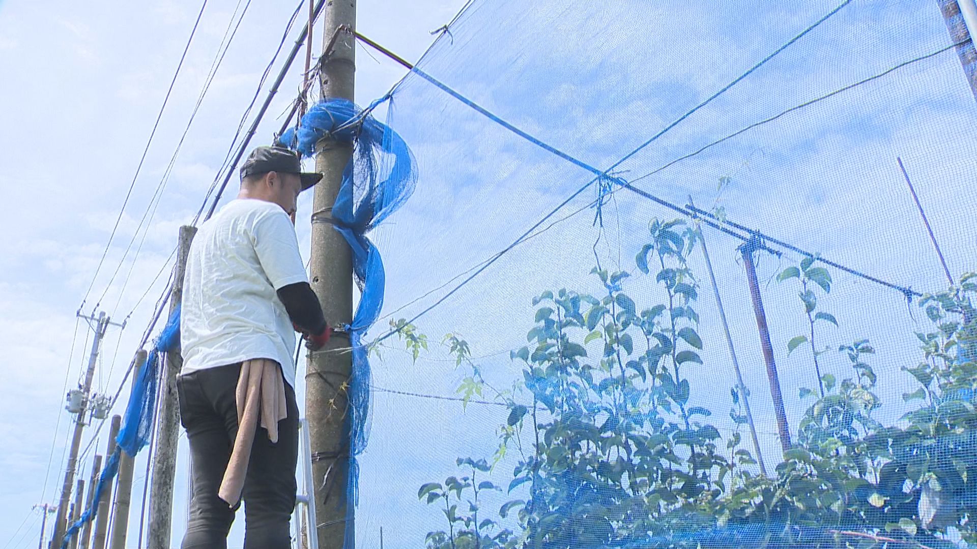 ルレクチエなど実がついたばかりの晩生(おくて)品種を育てているこちらのナシ畑では、成長時期のナシの実への影響が少なくなるよう25日から防風用の網を張り巡らせて対応しています。