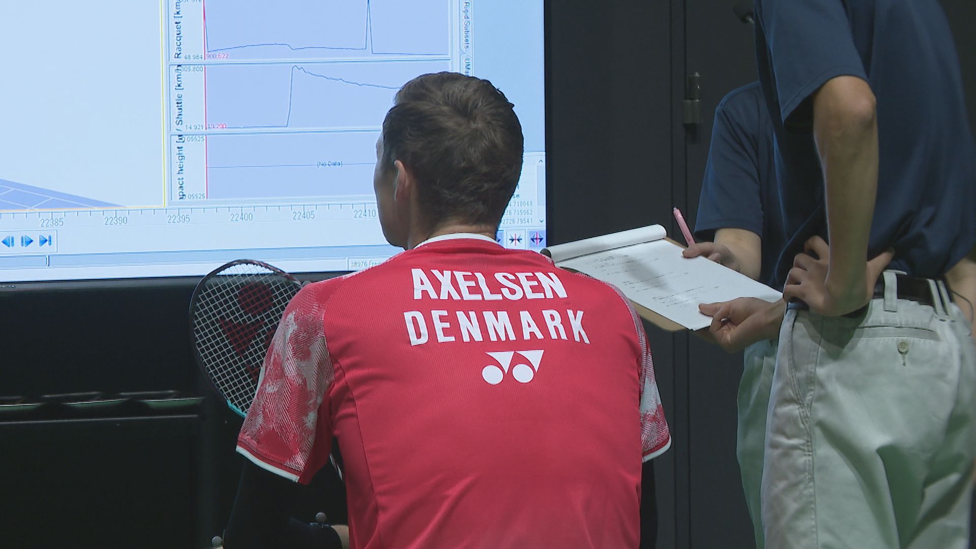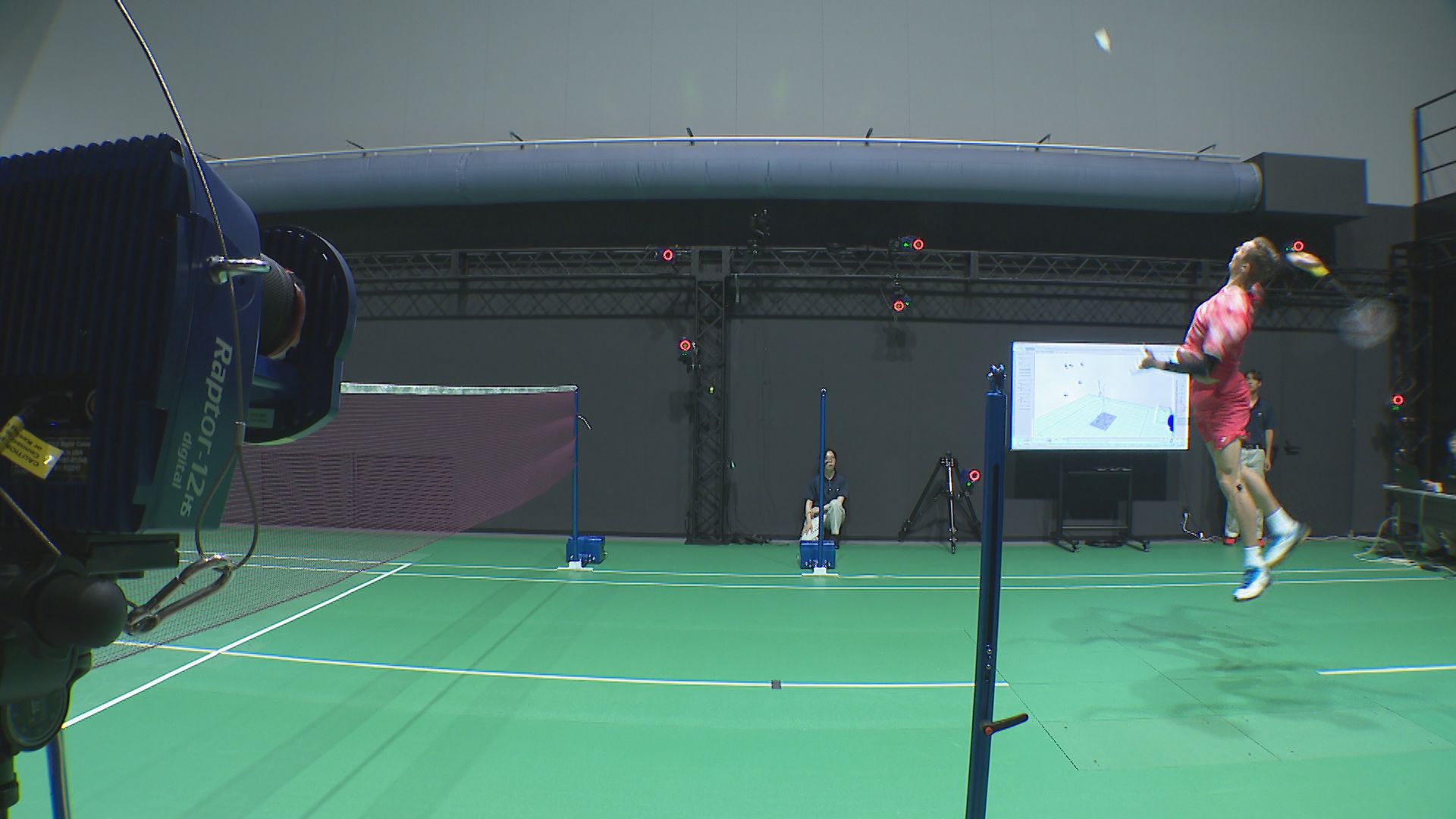 この部屋では、体にマーカーを装着してプレーすることでスイングのスピードや角度、シャトルのスピードなどを解析でき、ラケットの違いなどを確かめて商品開発にもつなげることができます。
