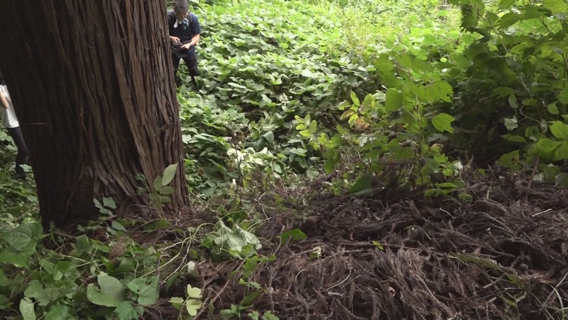 「この辺でクマに後ろから引っかかれて、クマと一緒にスギの木の横から草むらに落ちた」