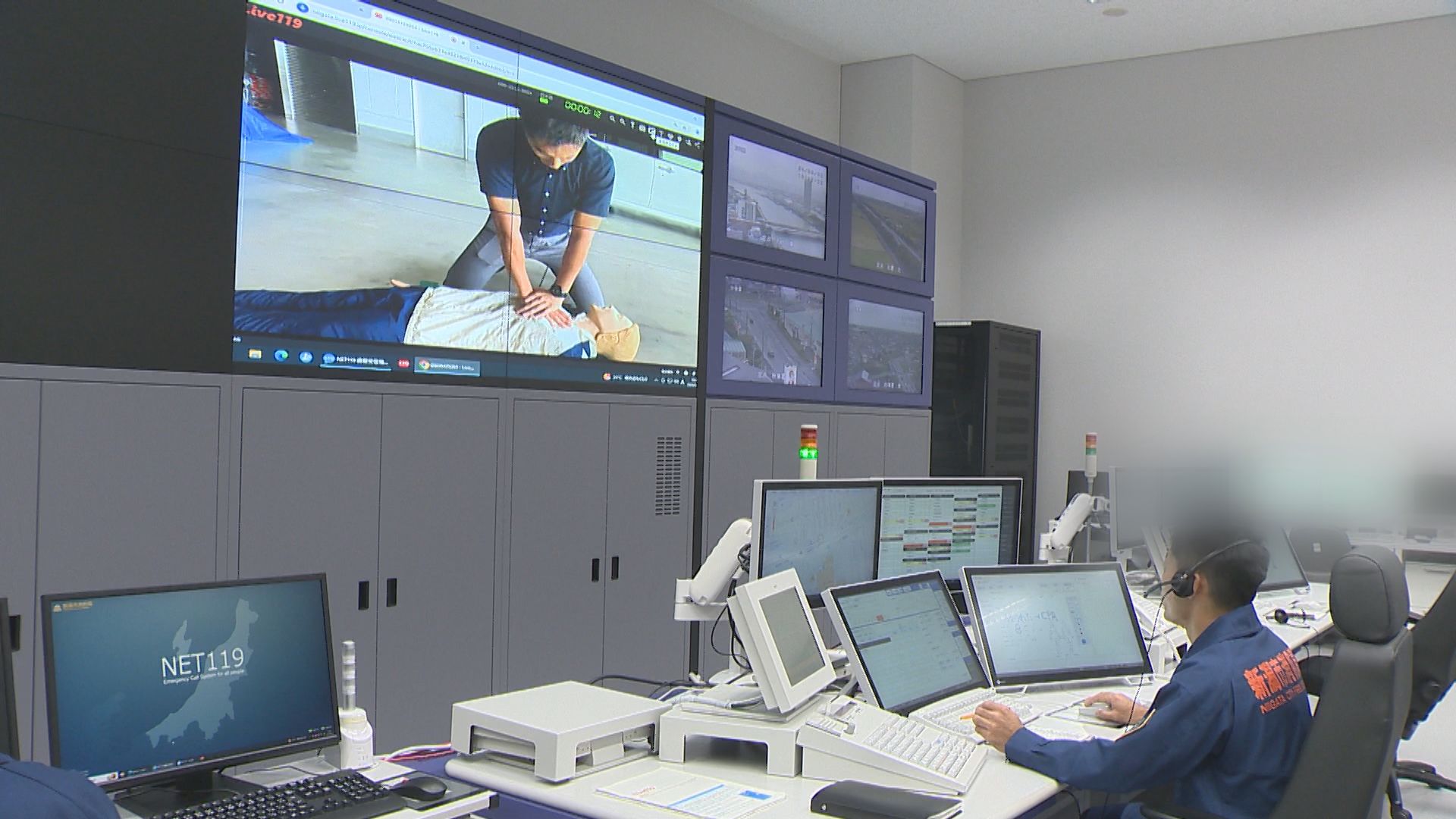 新潟市消防局消防指令管制センターで指示を出す指令員。目の前の画面に映し出されていたのは、倒れている男性を救助する様子です。