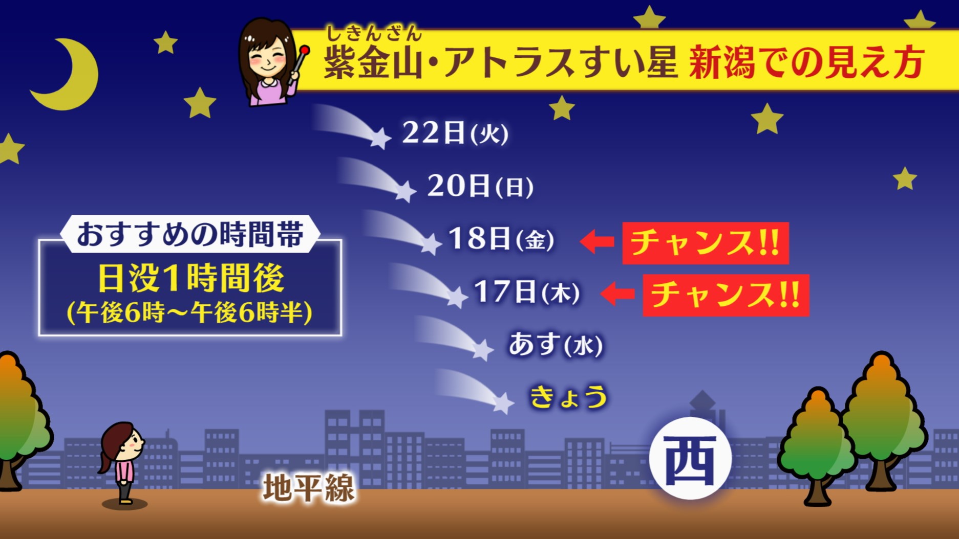 10月12日~14日の3連休は「紫金山・アトラス彗星」が日本各地で見られ、新潟県内でも見ることができた。次に紫金山・アトラス彗星が地球に接近するのは3万年後とも言われている。新潟県内では、17日・18日にも紫金山・アトラス彗星が見ることができそうで、このタイミングが一生に一度のラストチャンスになるかもしれない。