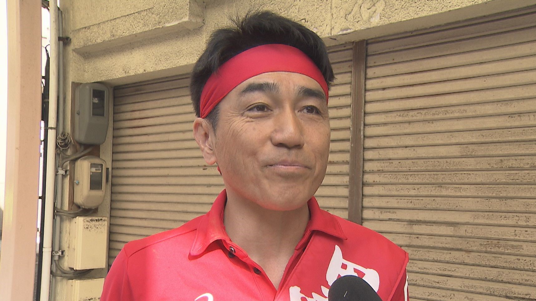 支援者とお揃いのはちまきで結束力を高める黒岩さん。