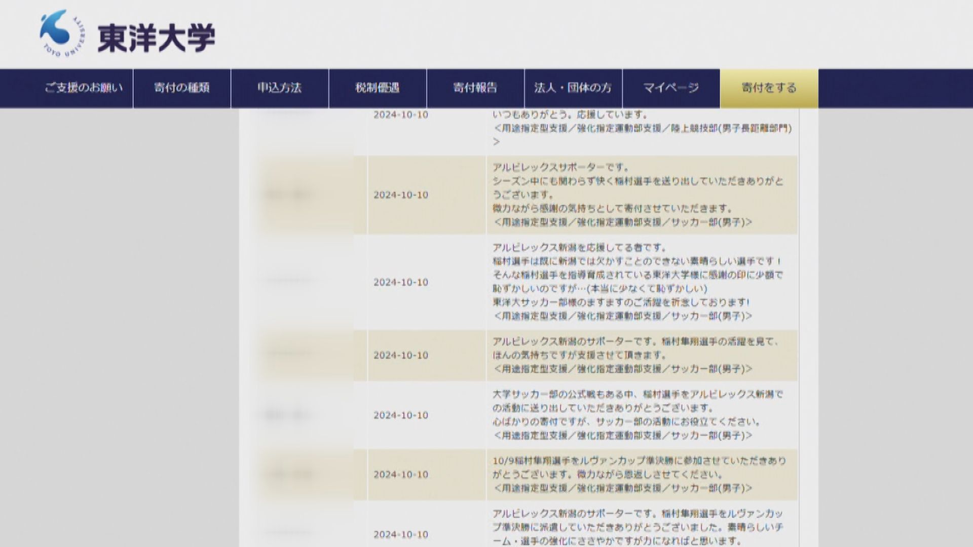 一方、大学のホームページには「大学リーグ期間中にもかかわらず、ルヴァンカップ準決勝に快く送り出していただき、ありがとうございます。感謝の気持ちを込め微力ながら寄付させていただきました」など新潟サポーターとみられる寄付者の声が。