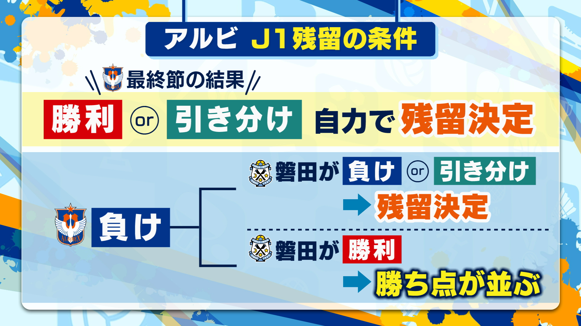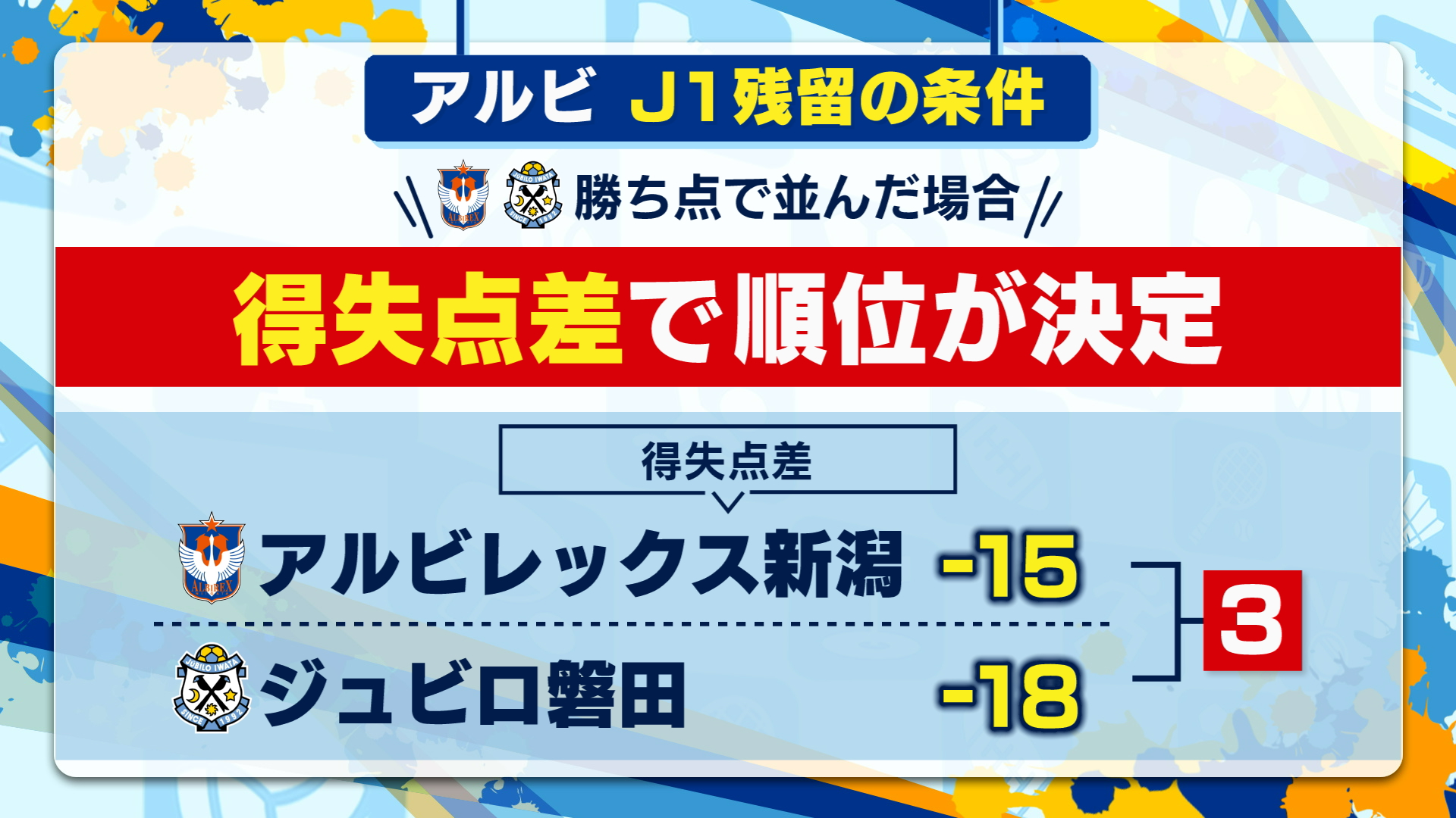 敗れた場合は18位・磐田が引き分けか負けの場合はアルビが残留。柏が敗れ、磐田が勝った場合は、勝ち点が3チーム並ぶことになる。