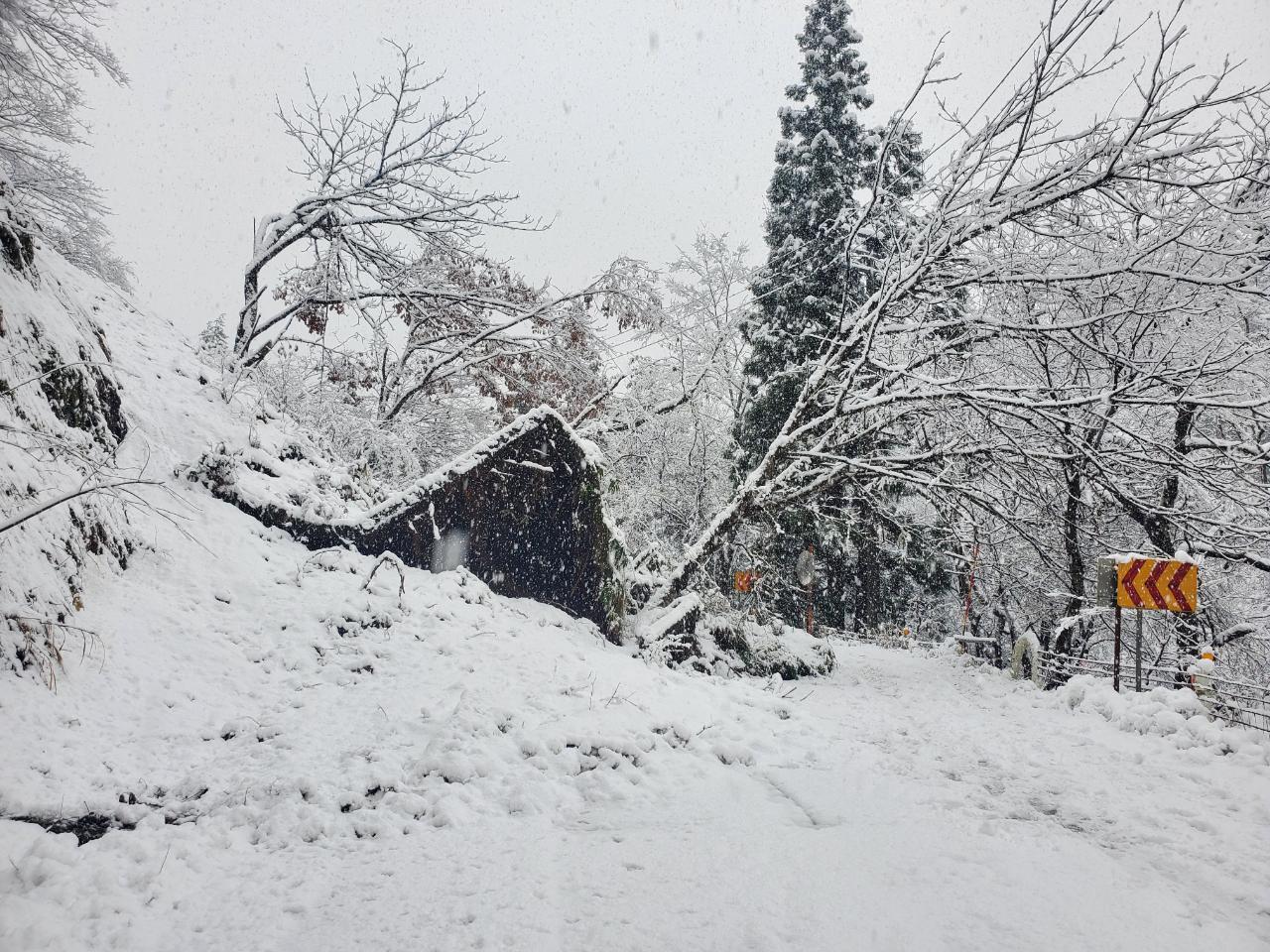 県は道路上の倒木撤去処理など作業を行っていますが、復旧見込みは経っていません。県は8日午前9時から復旧に向けた現地調査を行い、今後の復旧方法について検討する方針です。
