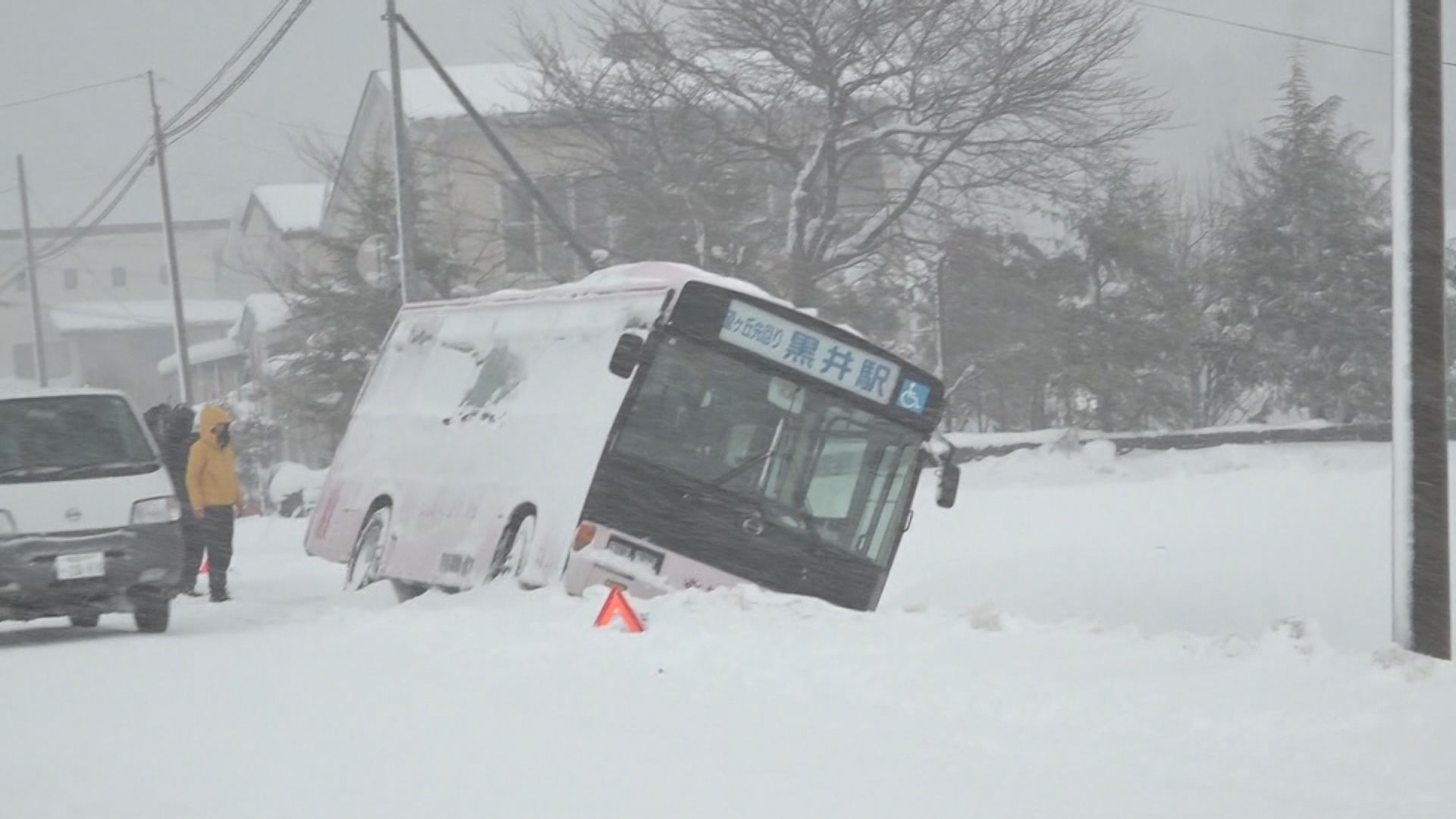 「ものすごい吹雪の中、トラックが横出しになってしまっています。さらにもう1台、路線バスも道を外れ、倒れてしまいました」