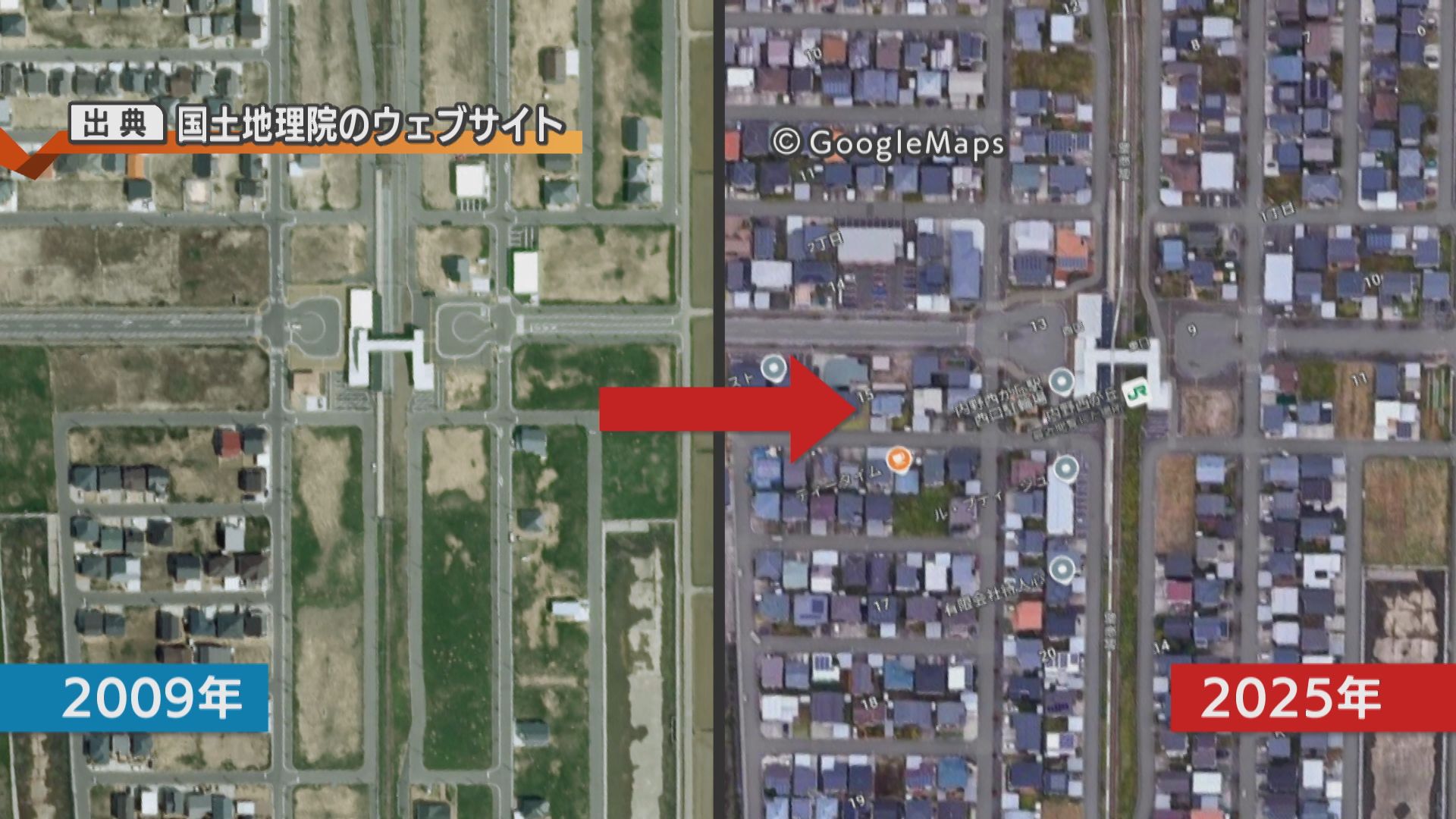 航空写真を見ると、約20年で駅周辺は畑から住宅地へと変化。線路沿いに次々と住宅が建設されていったことがよく分かります。