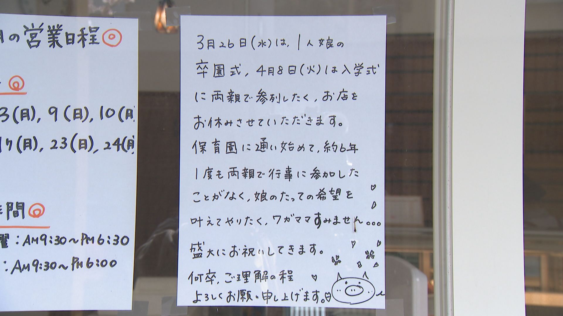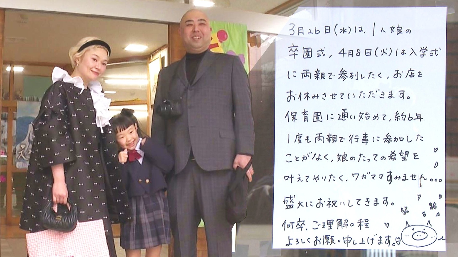 「3月26日は一人娘の卒園式に両親で参列したくお店をお休みさせていただきます。保育園に通い始めて約6年。1度も行事に参加したことがなく、娘たっての希望を叶えてやりたくワガママすみません…」