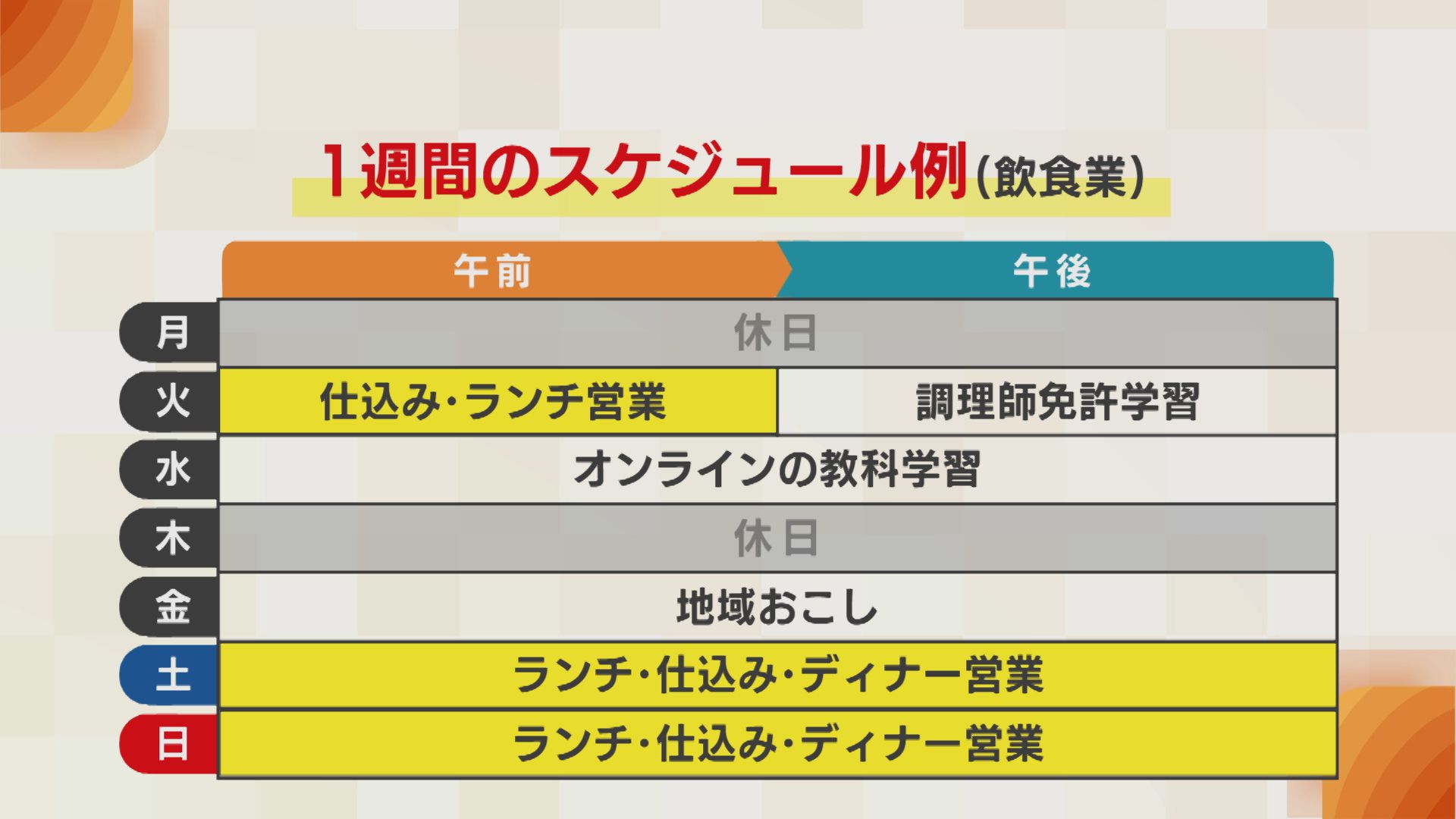 こちらは飲食業での職業訓練を選択した生徒のスケジュールの一例です。