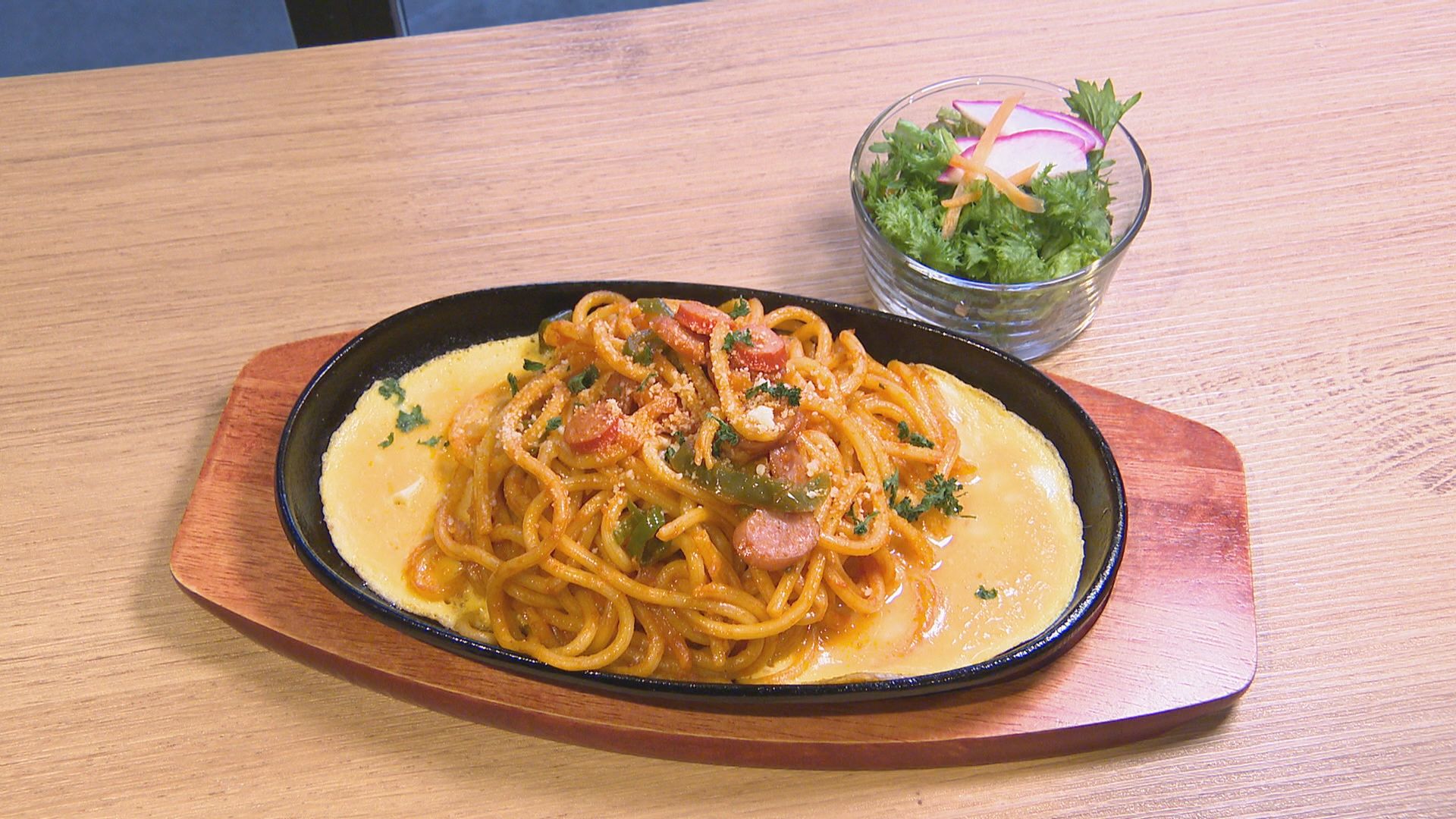 そんな吉田さんがオススメするデンデンの看板メニューが〈鉄板ナポリタンセット 1100円〉。
