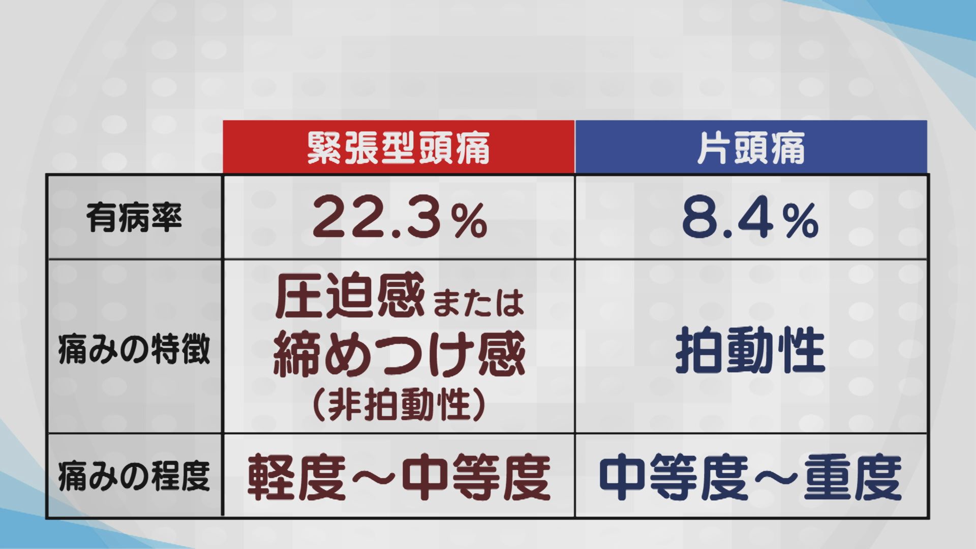 一つは『緊張型頭痛』。肩や首のこりが強くなり、頭が締め付けられるような痛みが特徴の頭痛で、痛みの程度は軽度から中等度。有病率は2割ほどと言われている。