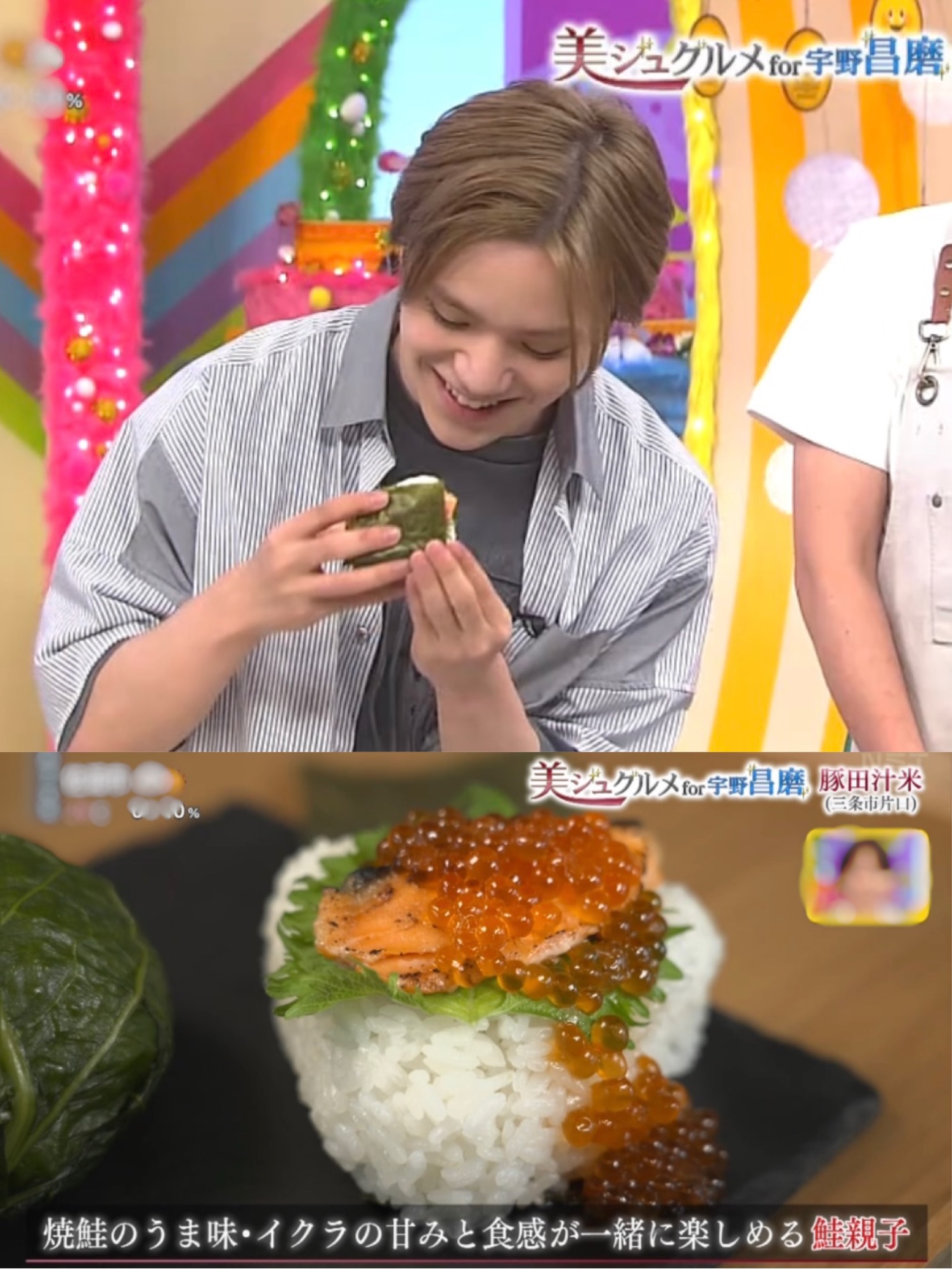 スタジオでは、海苔からこぼれ落ちそうなほどたくさんの鮭といくらがのった