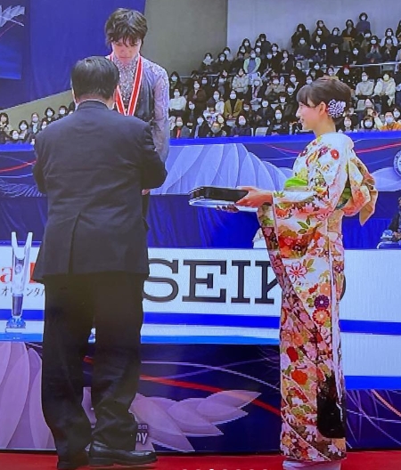 私が大学3年生の時。当時通っていた着物の着付け教室で声がかかり、フィギュアスケートの国際大会の表彰台でメダルを渡す「振袖ガール」を務めました。