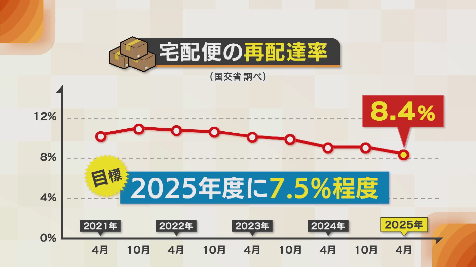 ドライバーの負担軽減のため、国交省は、宅配便の再配達率を25年度に7.5%程度まで削減することを目指しているが、25年4月の調査では8.4%と減少傾向にはあるものの、目標からは遠いのが現状だ。