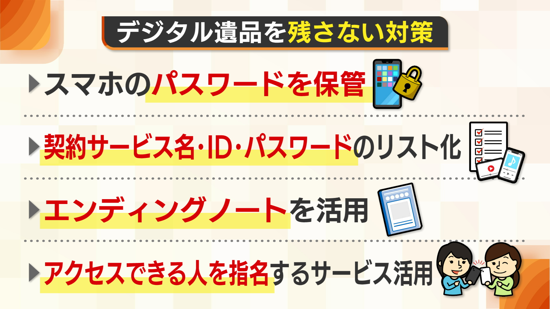 こうしたトラブルに遭わないための対策として示されているのは、スマホのパスワードの保管、契約サービス名やID・パスワードのリスト化、エンディングノートの活用などだ。