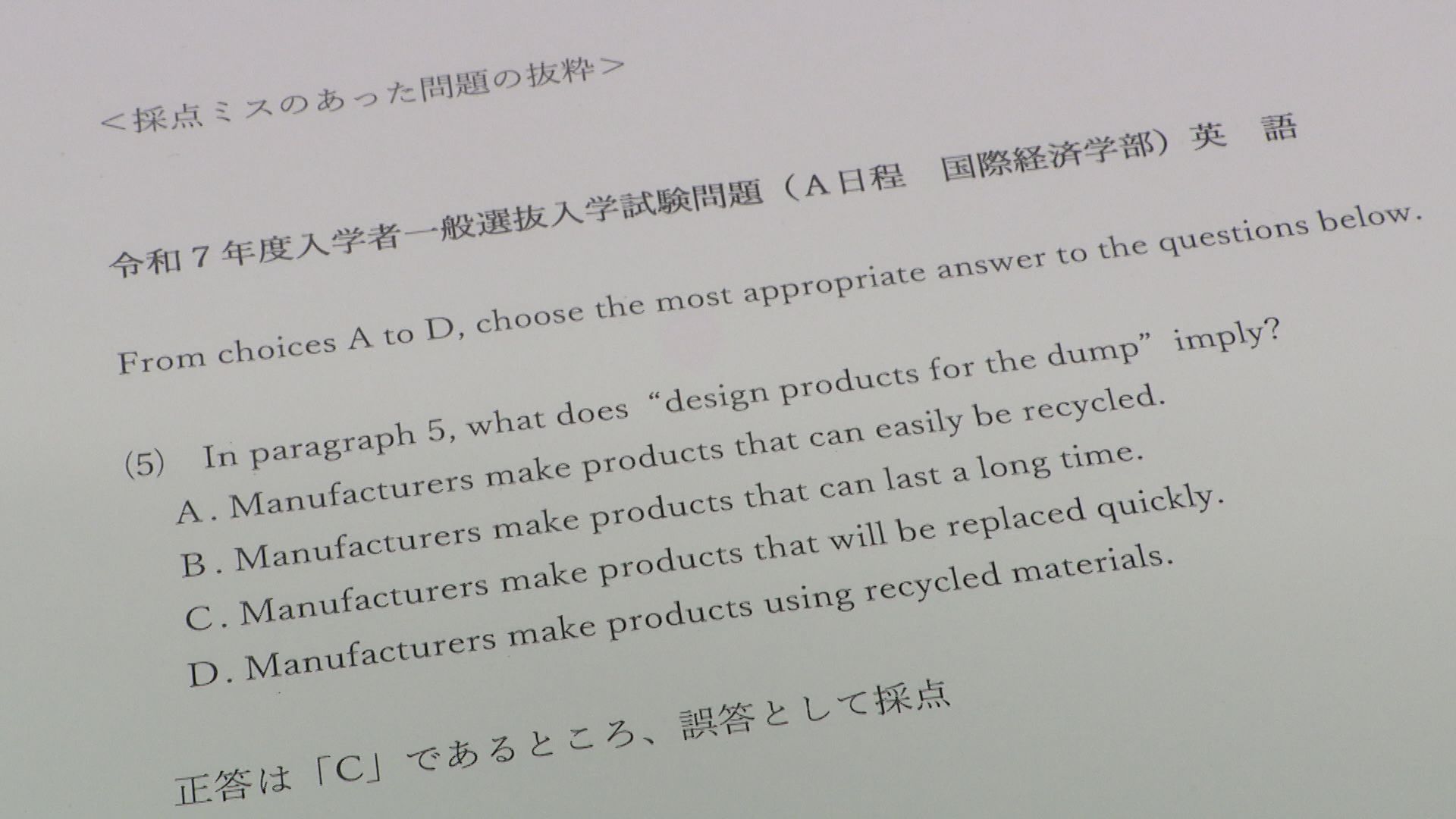A日程とB日程で問題は異なるが、採点ミスは選択問題で発生。正しい選択肢を不正解としていた。
