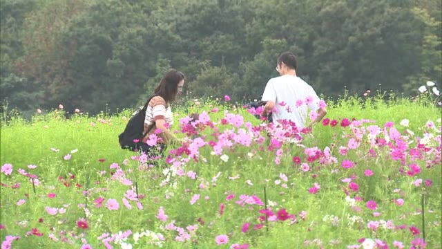 今年は夏の猛暑の影響が心配されましたが、例年通り約25万本のコスモスが鮮やかに咲き誇り、10月8日は時折雨が降る中、訪れた人がカメラを向けていました。