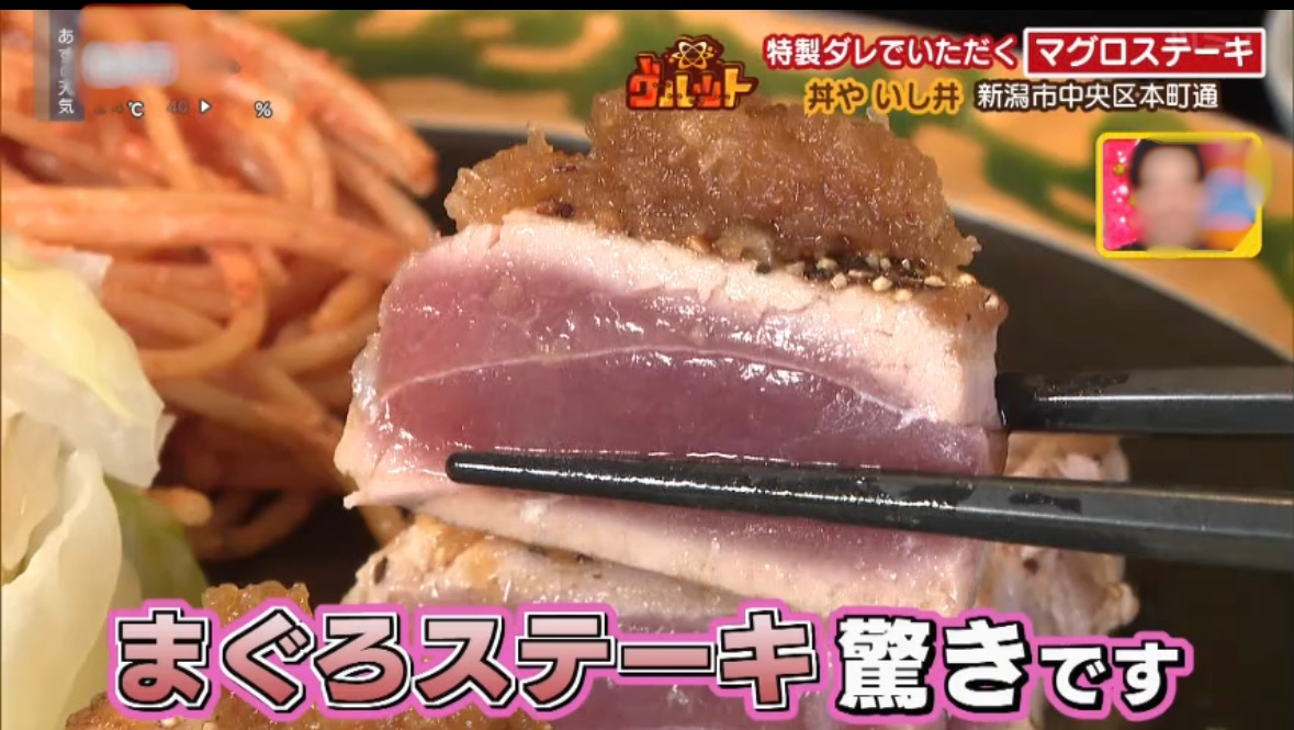 紹介したのは、分厚く切られたマグロをレアに焼き上げた、マグロステーキ!外は香ばしく、中はトロっと新鮮なマグロの身が楽しめます。