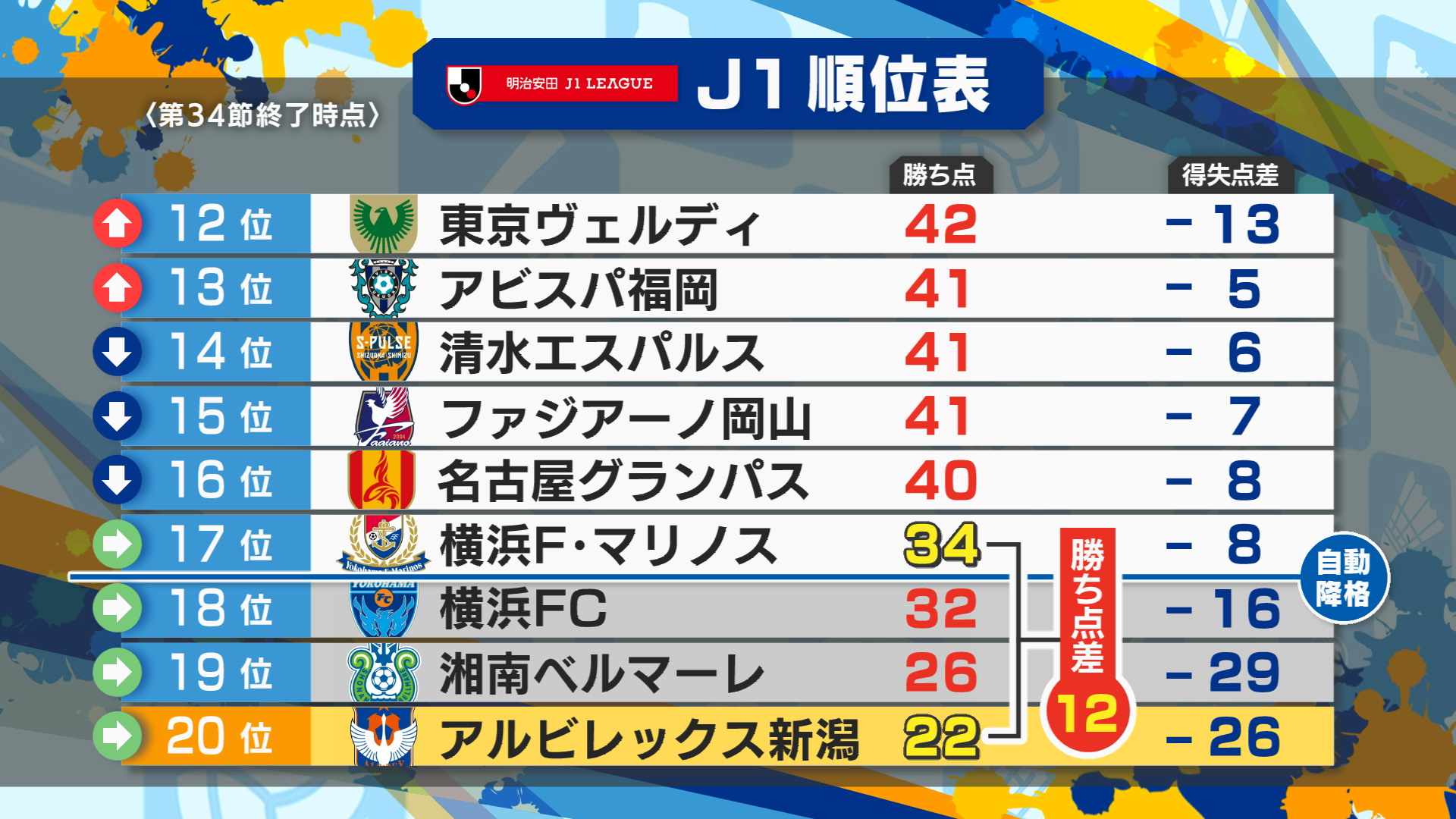 18日の試合で勝ち点を積み上げられなかったアルビに対し、17位の横浜F・マリノスが勝利したことから、残留圏との勝ち点差は12に広がりました。