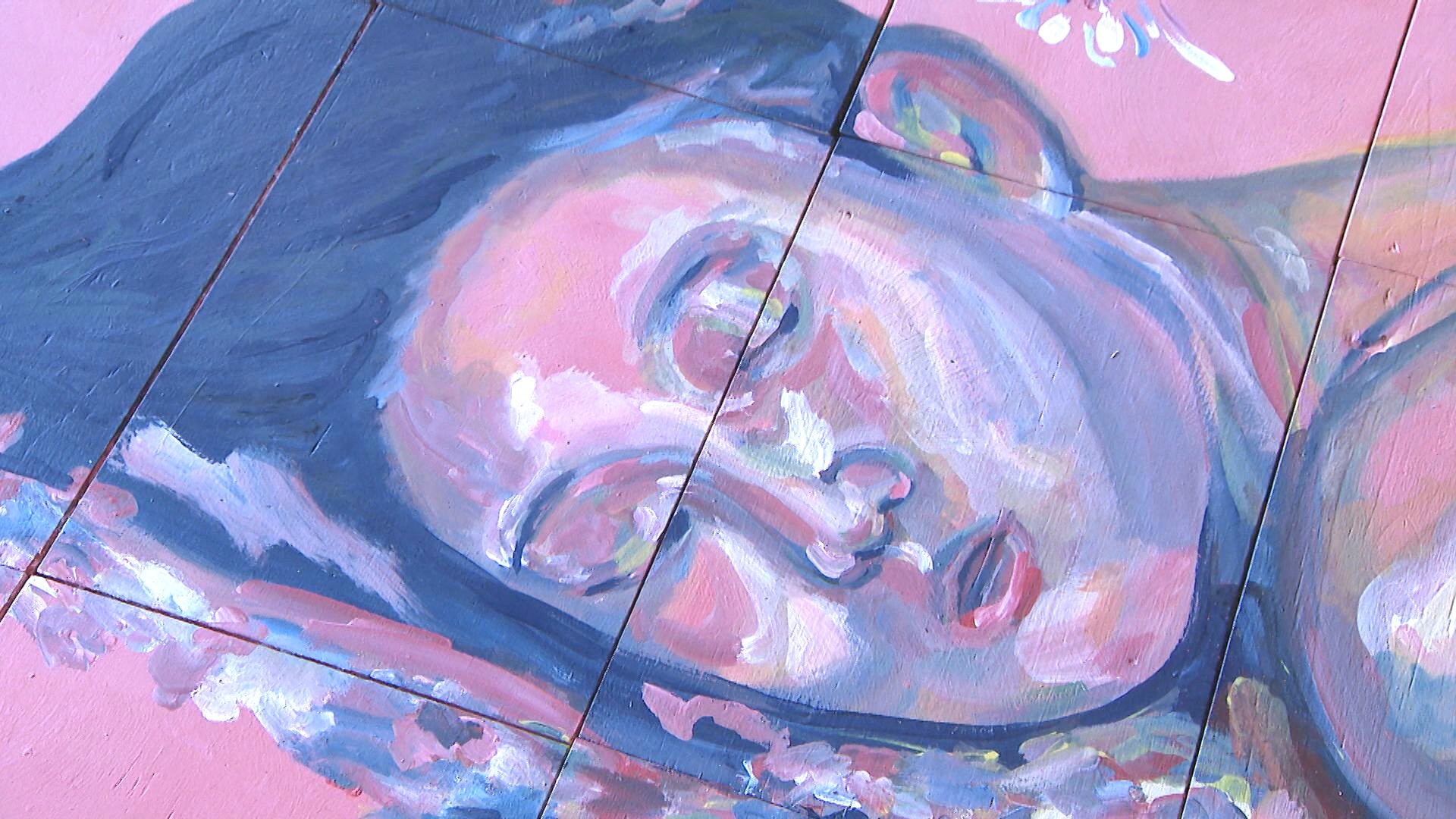 アニーさんが手がける大きな絵は完成後、分割してクラウンドファンディングの支援者に返礼品として届けることからイメージしたという。