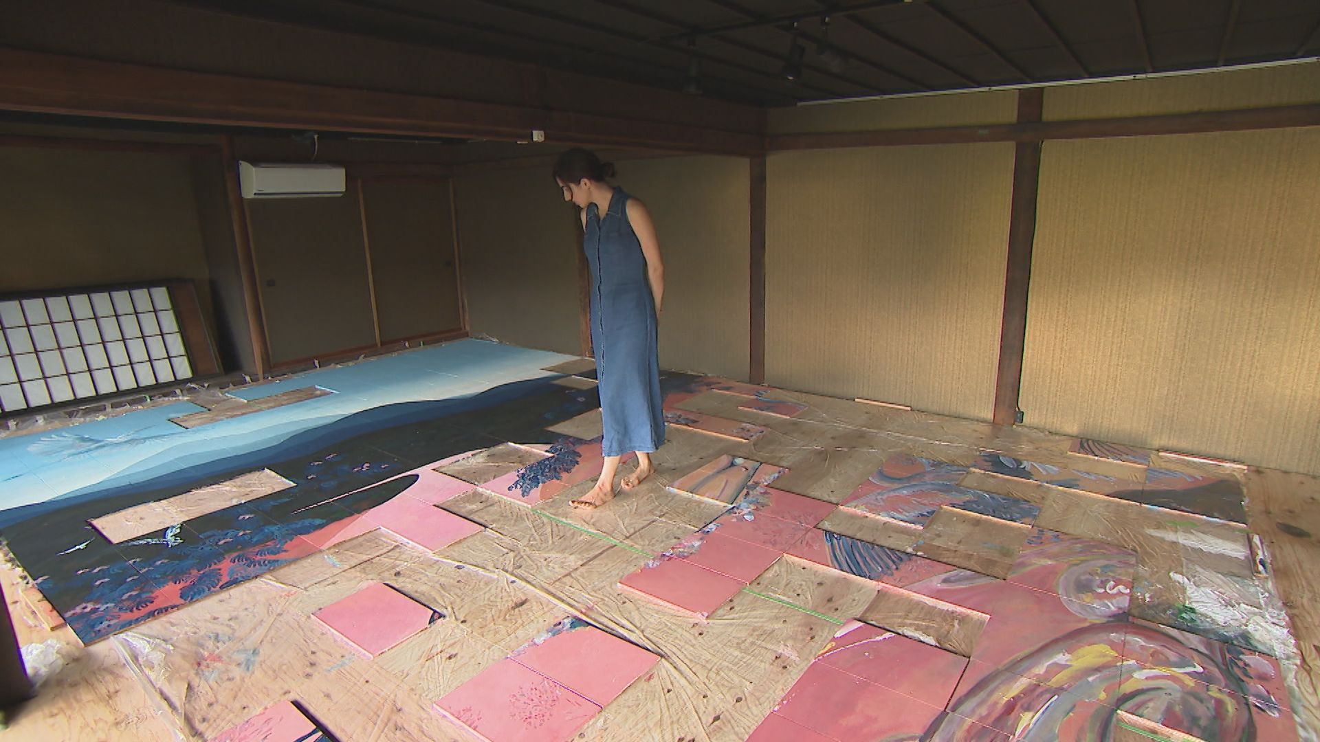 2025年7月、広い和室の床一面に並べられた板に、ペンキやアクリル絵の具を使い、思い思いの色を重ねていた。