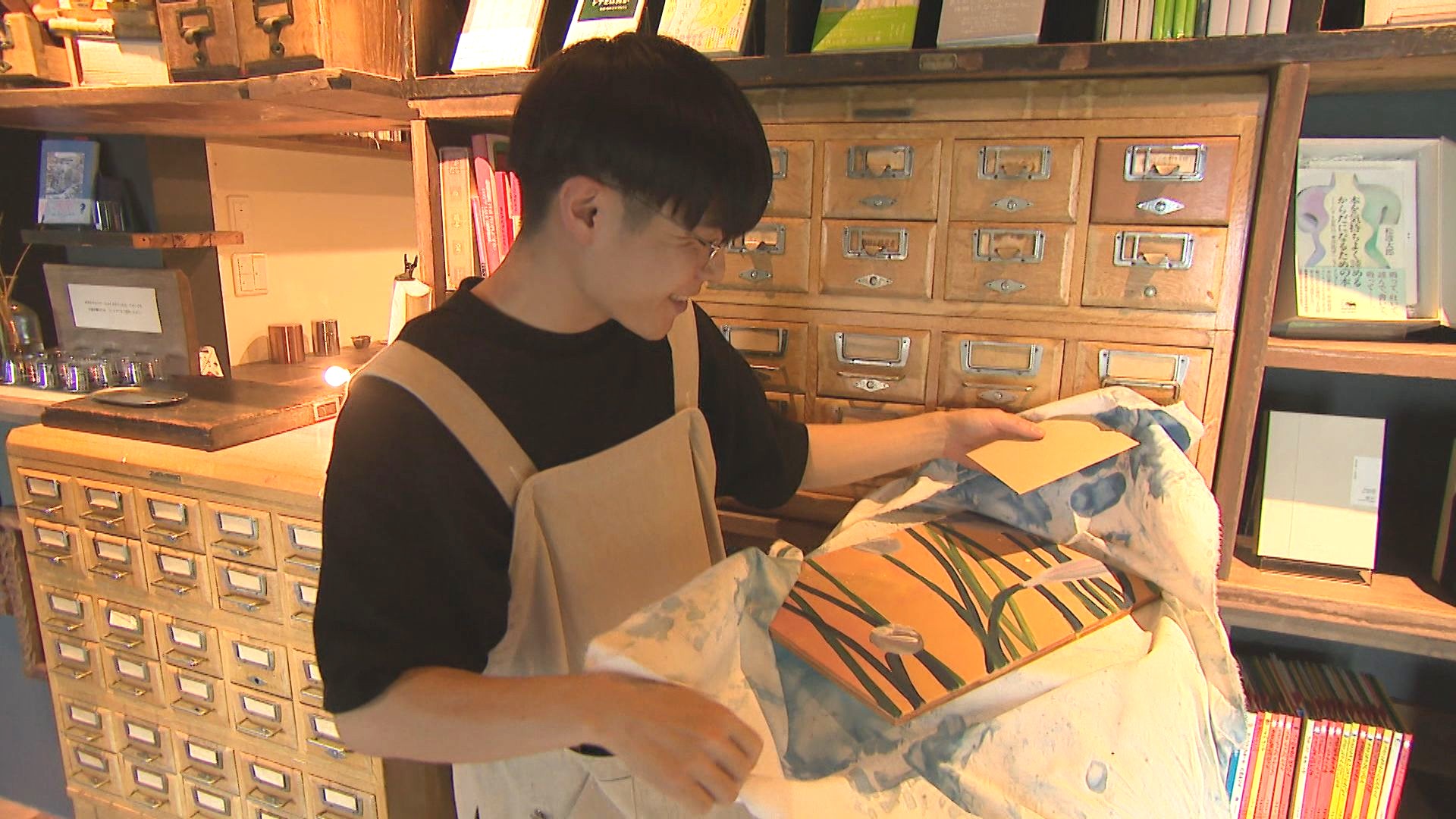 最初に訪れたのは、弥彦村の図書館。ブックディレクターを務める男性が支援者で返礼品を図書館に飾ることにしたという。