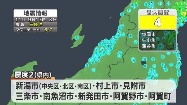 三陸沖でM6.7の地震 新潟県内でも中越や下越で震度2を観測 2025.11.09 9日午後5時3分頃、三陸沖を震源とするマグニチュード6.7の地震があり県内では中越と下越で震度2を観測しました。 9日午後5時3分頃、三陸沖を震源とするマグニチュード6.7の地震があり県内では中越と下越で震度2を観測しました。県内で震度2を観測したのは新潟市(中央区・北区・南区)・三条市・村上市・見附市・南魚沼市・新発田市・阿賀野市・阿賀町、震度1を広い範囲で観測しました。最終更新日:Sun, 09 Nov 2025 18:23:37 +0900 新潟県 地震