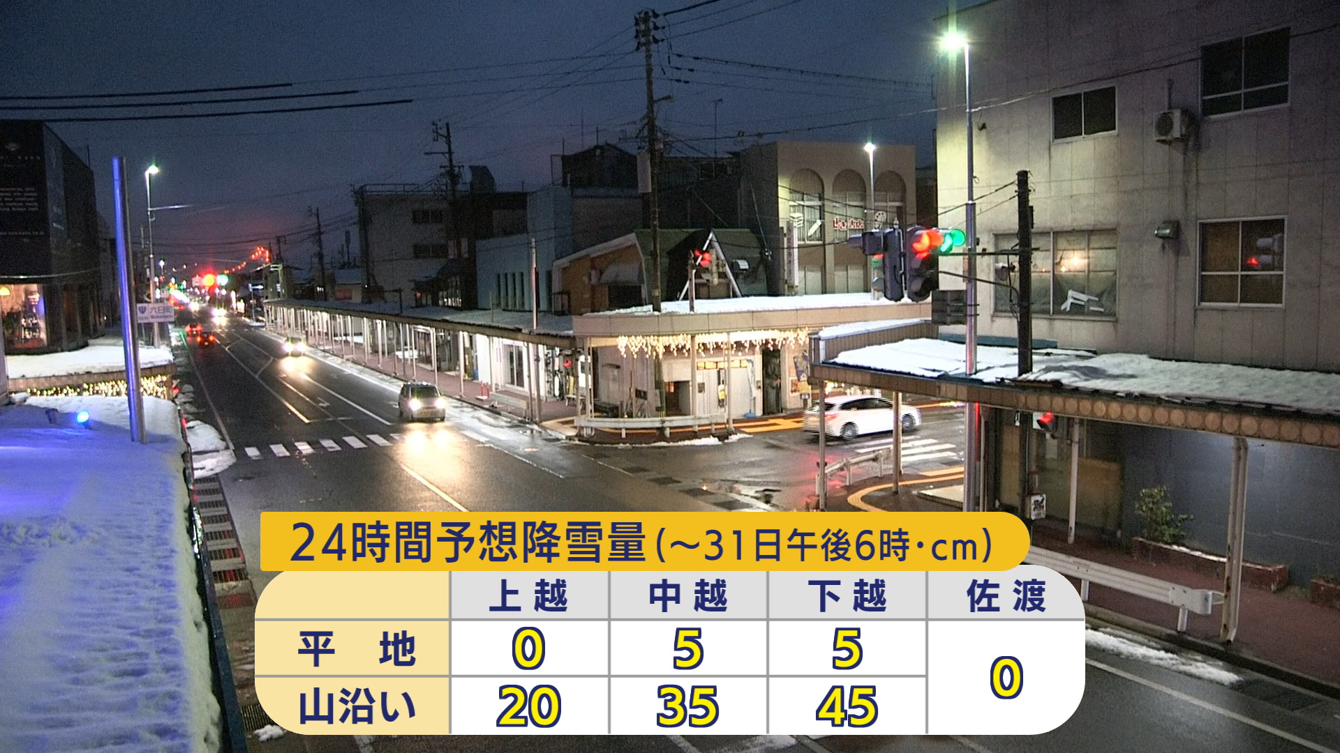 県内は31日も寒気の影響を受ける見込みで、31日午後6時までの24時間に降る雪の量は、下越の山沿いで最大45cm、中越の山沿いで最大35cmなどと予想されています。