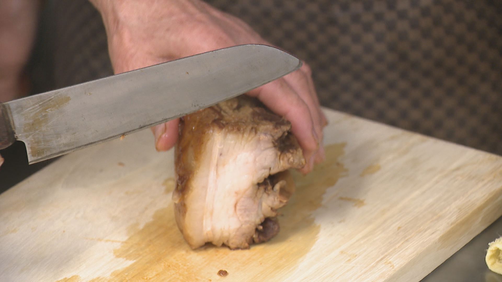 外国産のものなど様々な豚を試した中で、形は崩れやすいものの、やわらかく脂の甘さが際立つ蛇喰豚を採用したという。