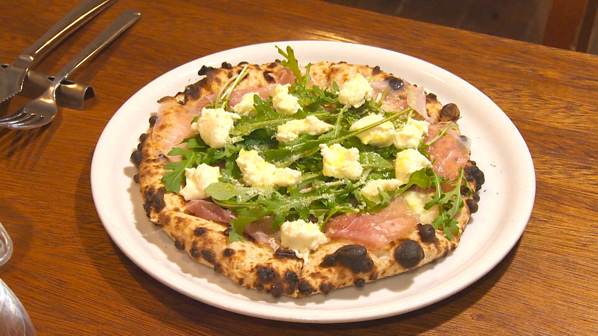 その生地を伸ばして、ピザ窯で約1分焼き上げ、最後に県産のルッコラなどのトッピングをのせれば、人気メニュー〈プロシュートルーコラ〉の完成だ。