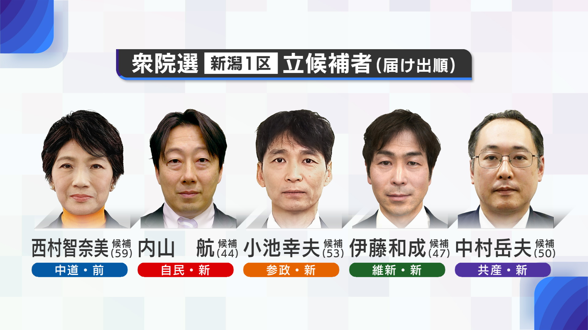 新潟1区には届け出順に中道改革連合の前職・西村智奈美氏、自民党の新人・内山航氏、参政党の新人・小池幸夫氏、日本維新の会の新人・伊藤和成氏、日本共産党の新人・中村岳夫氏の5人が立候補している。