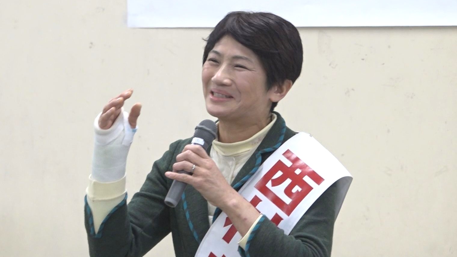 「見事にすってんころりんとやってしまって、右手をついてしまいました」と選挙戦2日目に凍った道で転倒し右手首を骨折したことを明らかに。