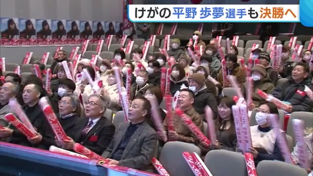 「時刻は午前3時を過ぎていますが、平野歩夢選手の地元・村上市に設置された会場には多くの人が集まっていて、平野選手のオリンピック連覇を応援で後押しします」