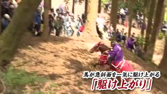 五穀豊穣などを祈る胎内市下赤谷集落のこの伝統行事は、農耕馬が減ったことで一度途絶えましたが、馬の養老牧場の呼びかけで11年前に復活しました。注目は神社の境内に設けられた急斜面を一気に駆け上がる「駆け上がり」